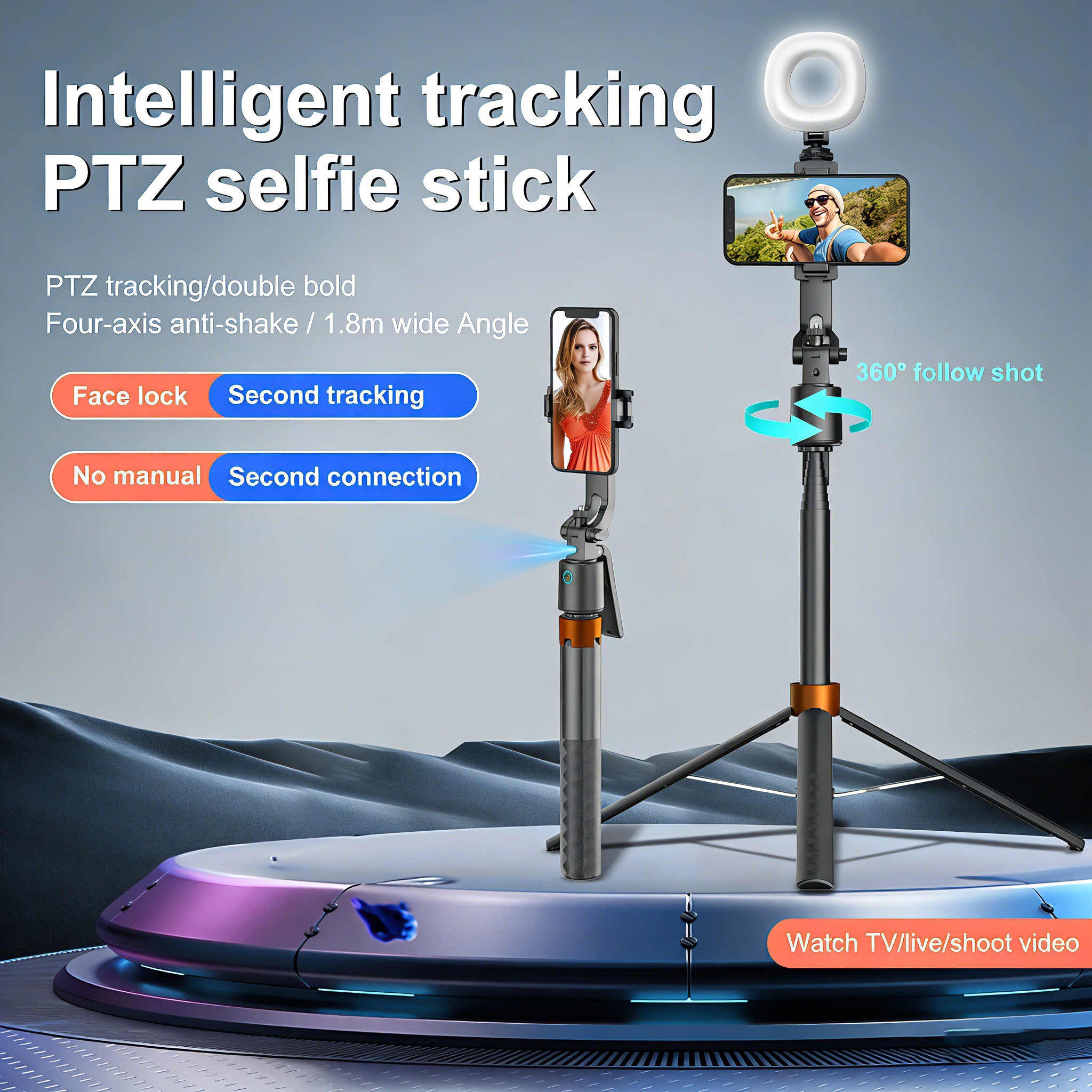 Smart AI Face & Body Tracking: No apps required. The built-in AI camera sensor recognizes and tracks your face and body in real-time. Simply turn it on, and it follows you smoothly as you move.