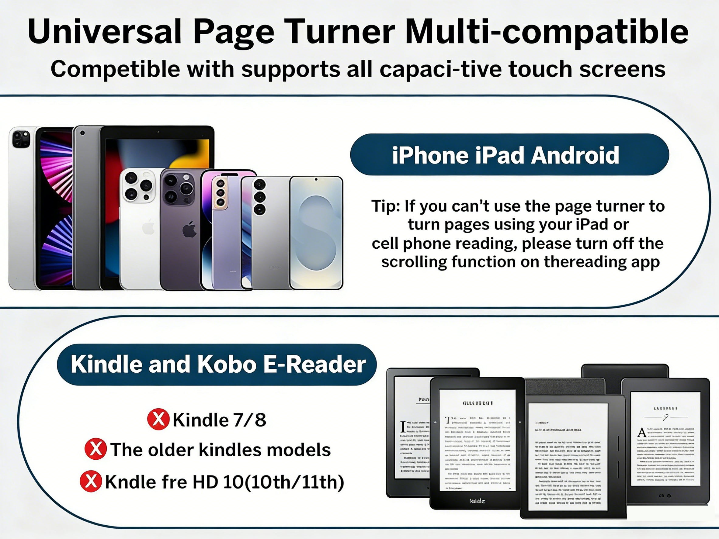 Compatibility: iOS (iPhone/iPad), Android (Samsung/Pixel), and Kindle App